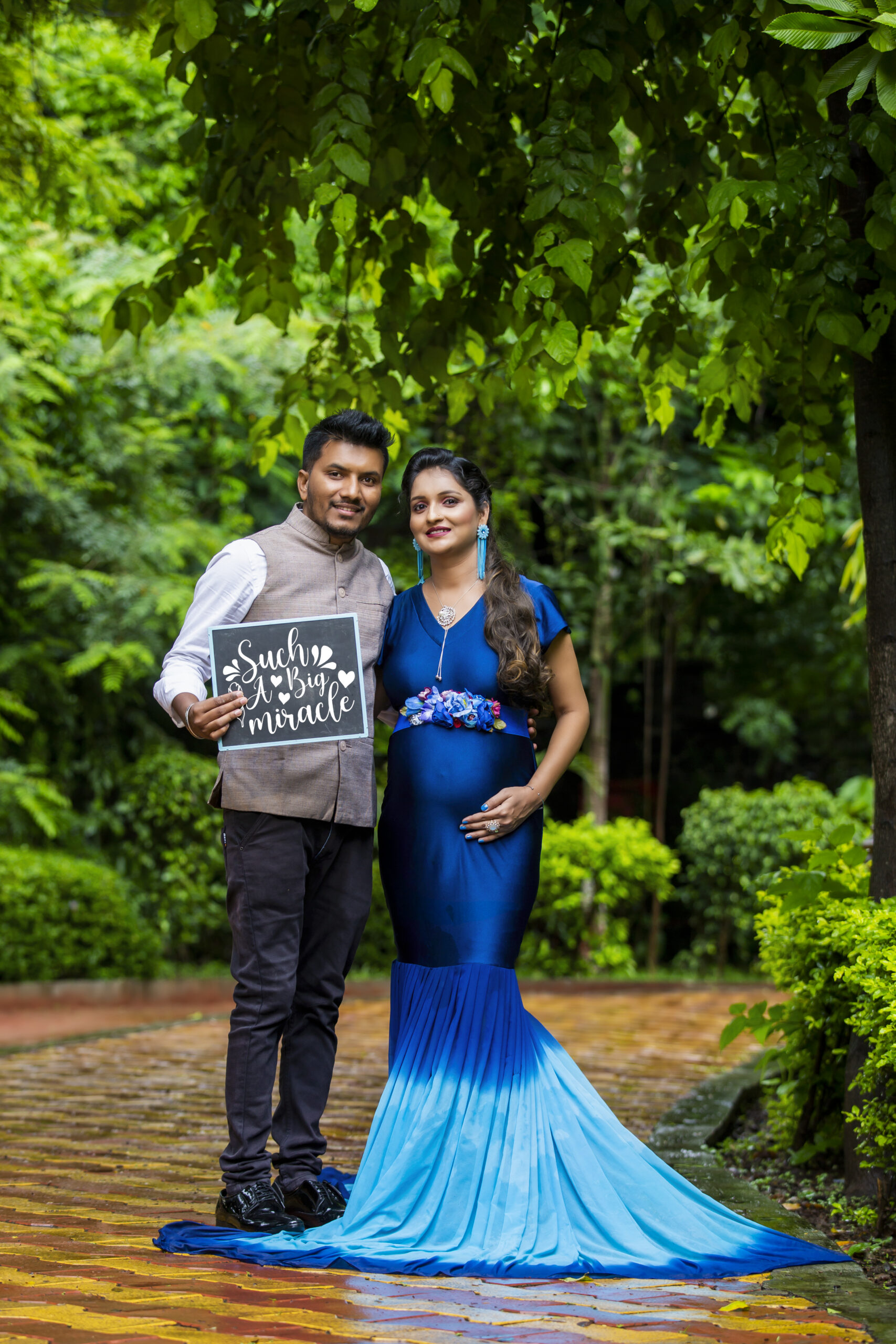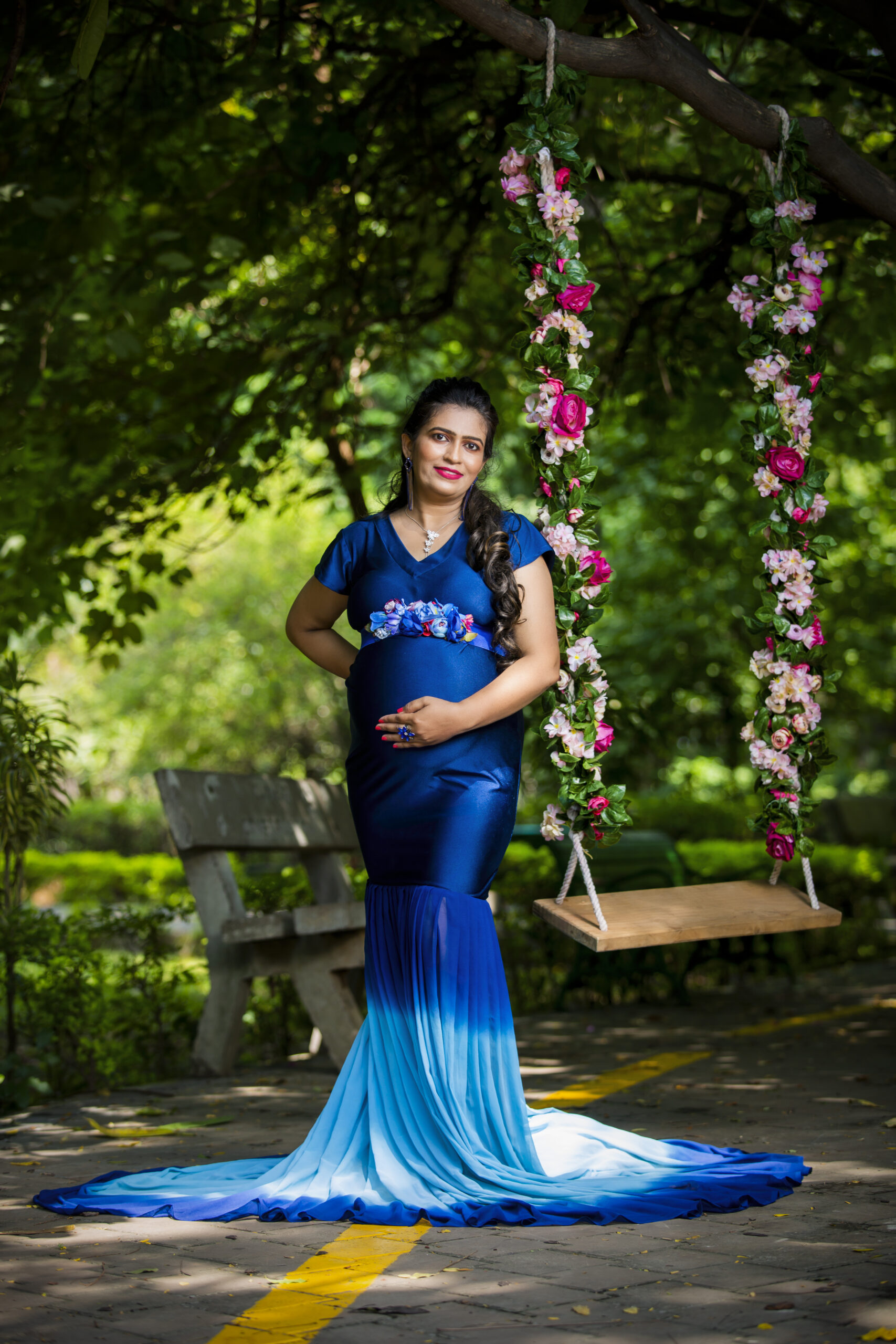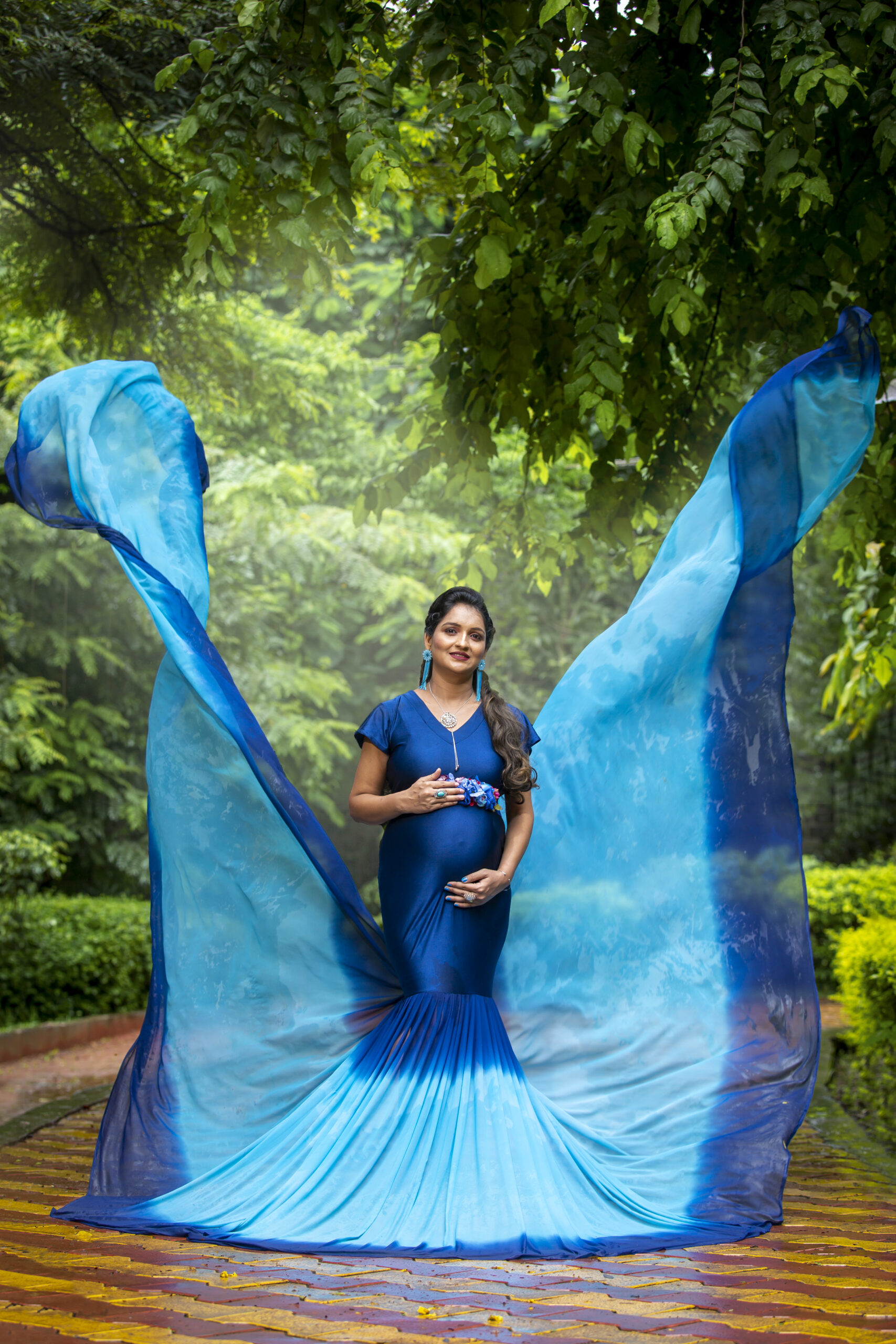 A blue shading maternity gown is an elegant and comfortable dress designed specifically for expectant mothers. The gown typically features a soft, flowing fabric that offers both style and ease of movement. The "blue shading" refers to a gradient or ombre effect in varying shades of blue, which creates a visually pleasing and soothing look. The gown might start with a deeper blue at the top, fading into lighter blues or even a soft pastel shade towards the hem.
