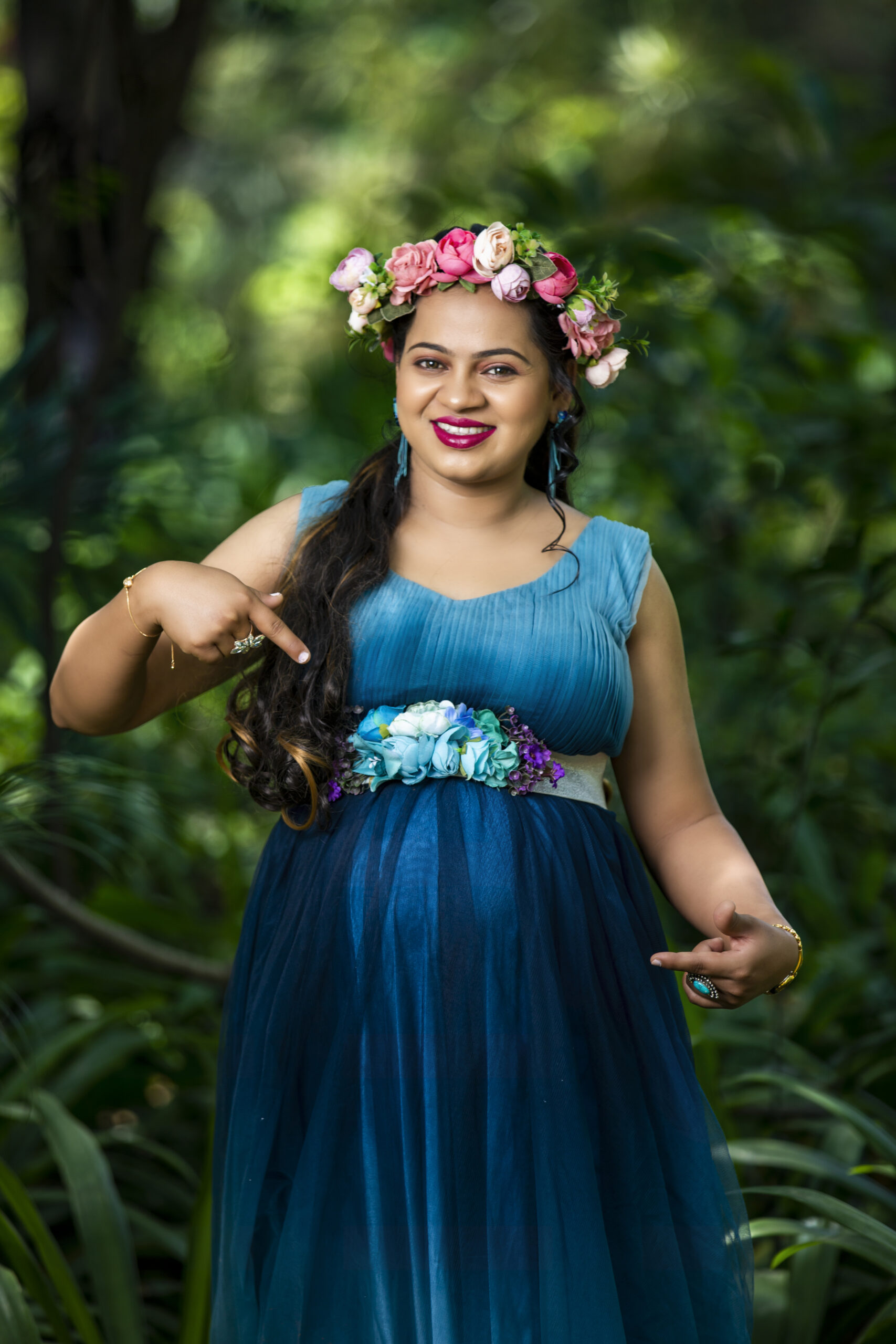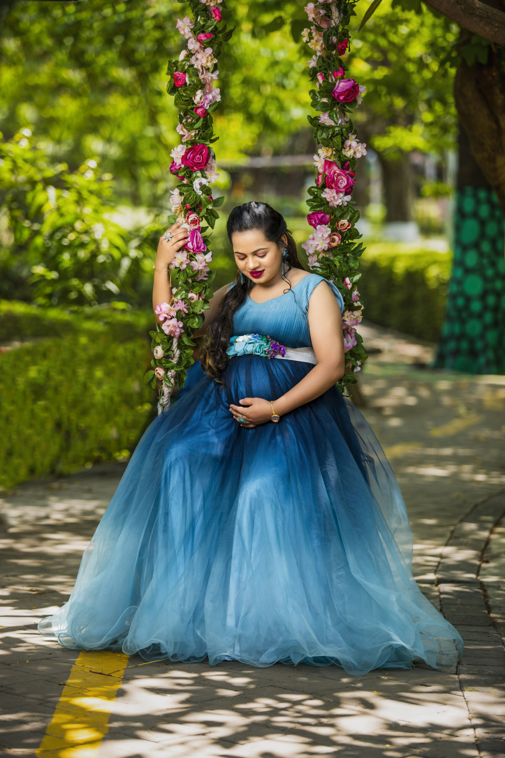 A shading maternity gown offers a unique, gradient color effect that adds depth and elegance to maternity wear. Imagine a gown that transitions from a soft, light shade at the top, such as green and gradually peacock green. This gradient effect can make the gown appear ethereal and eye-catching, perfect for special events or photoshoots.