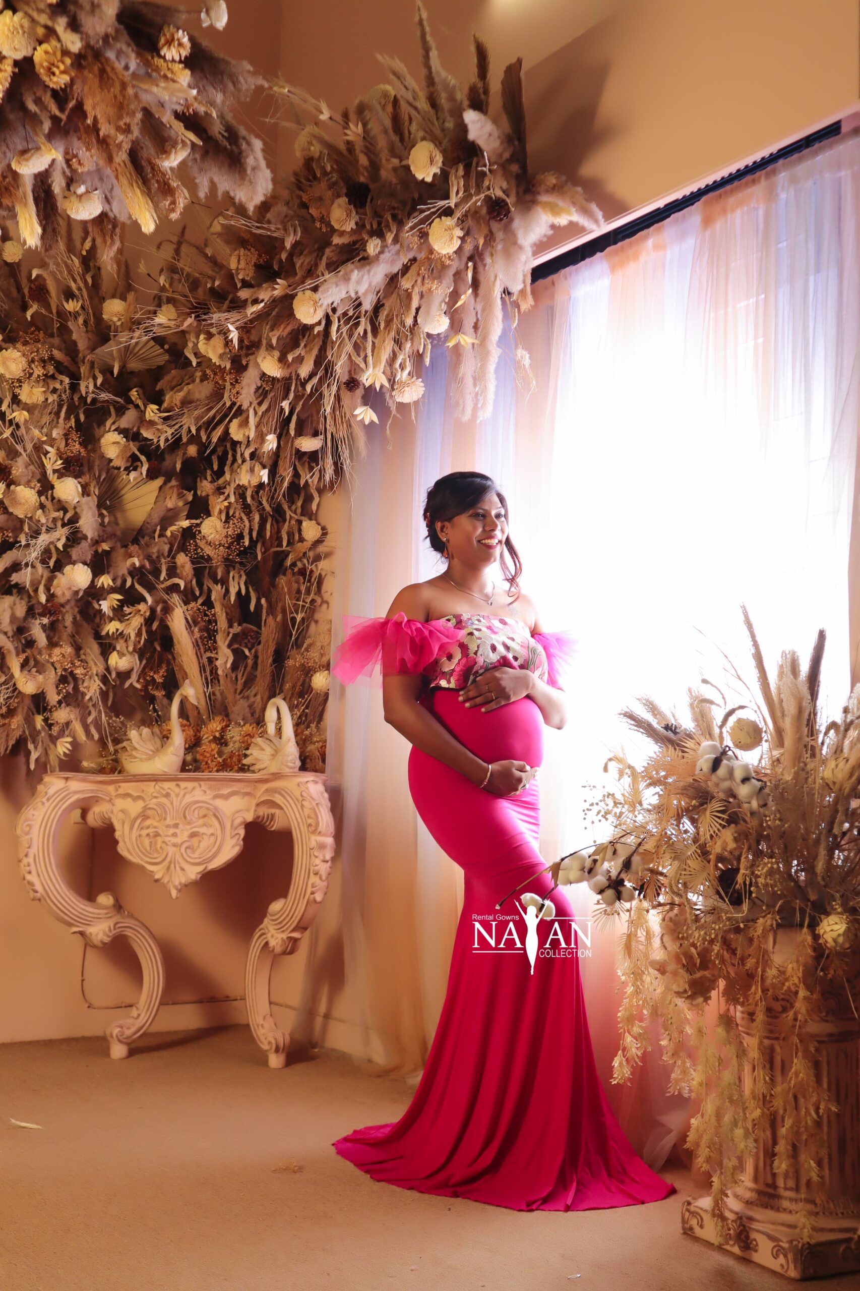 The pink Phoenix ruffle maternity gown is perfect for special occasions like maternity photoshoots,