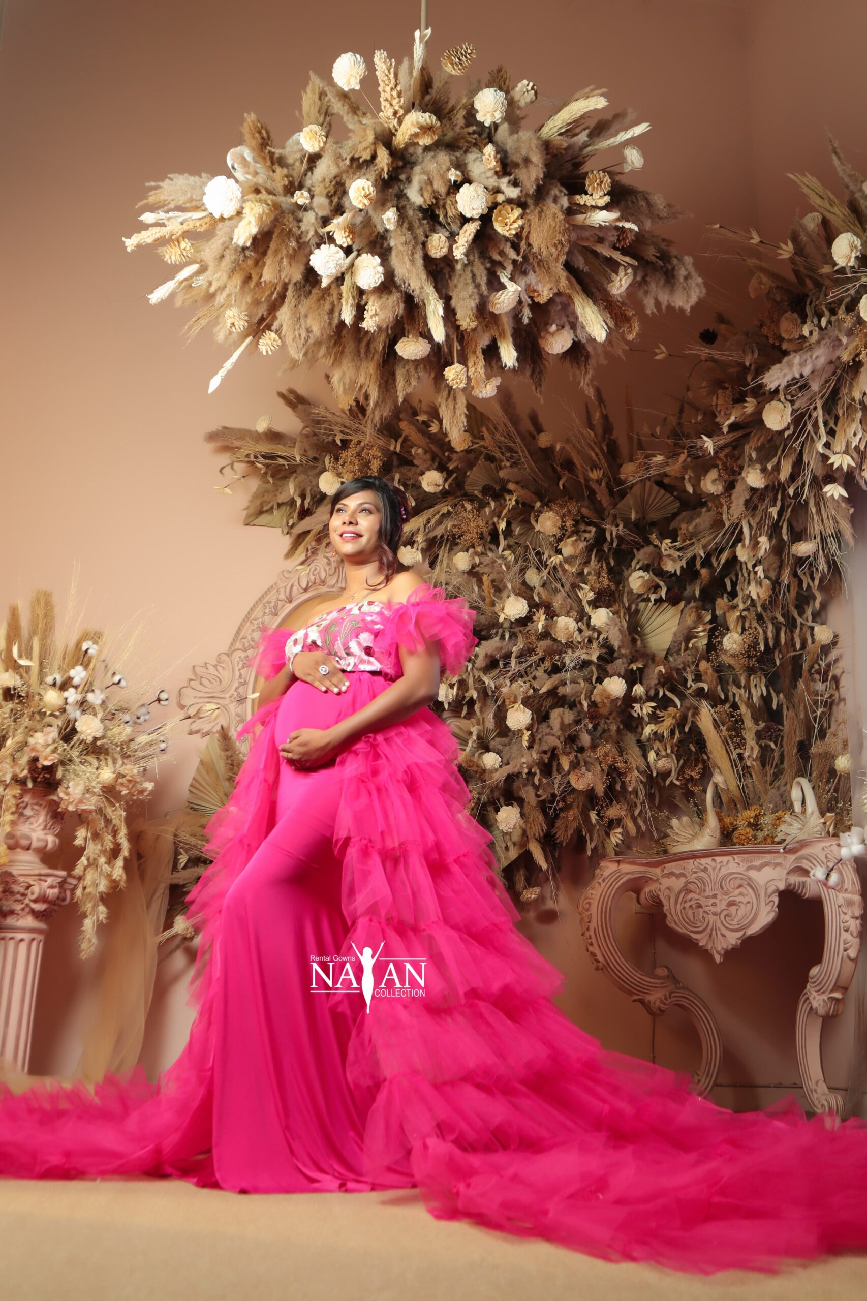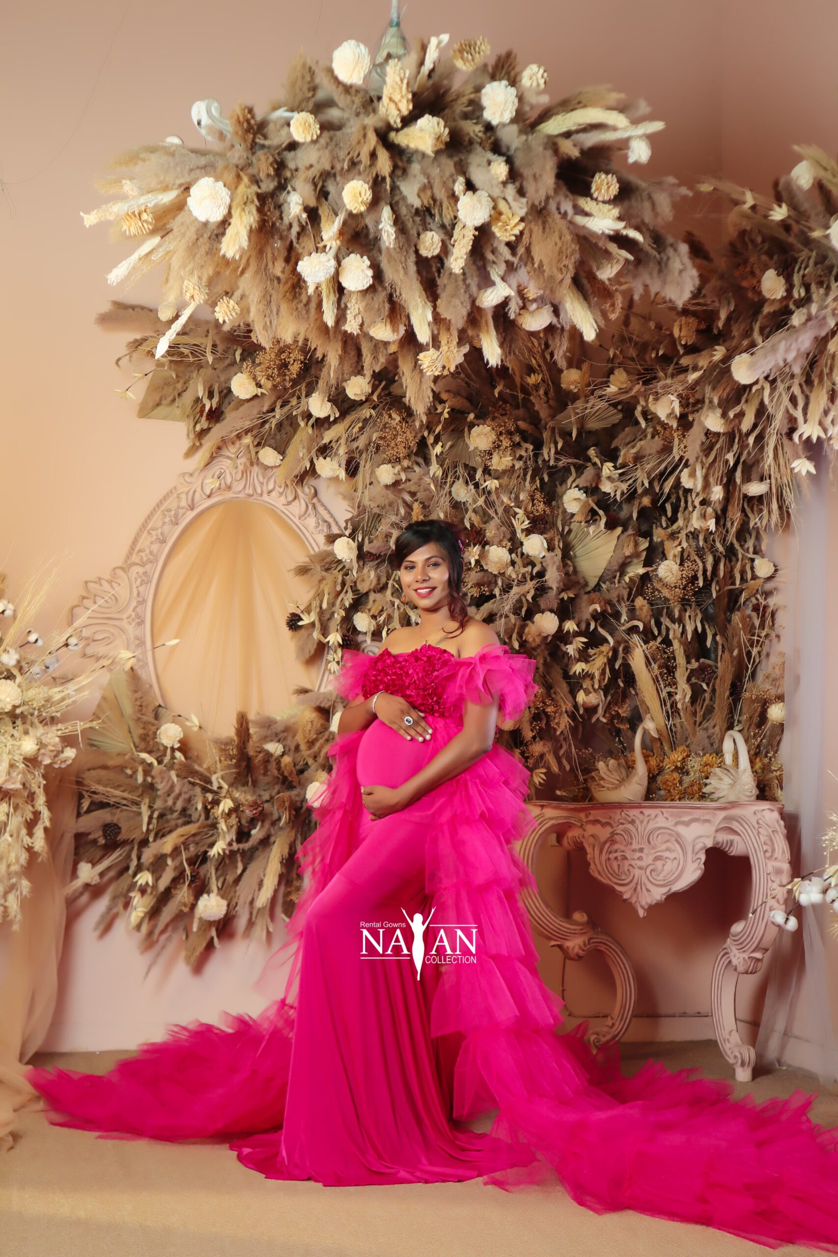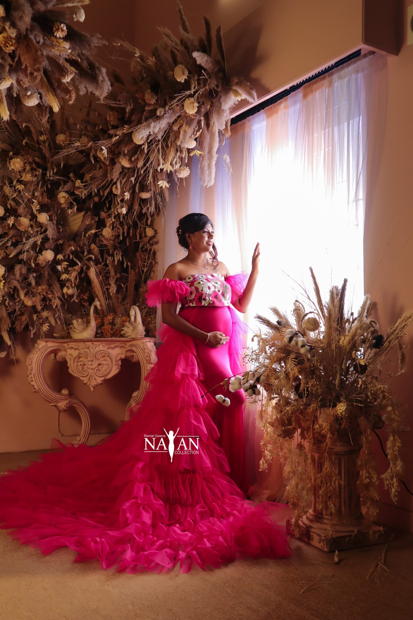 A pink Phoenix ruffle maternity gown is a stunning and elegant dress designed for expectant mothers, combining a bold color with delicate, romantic details.