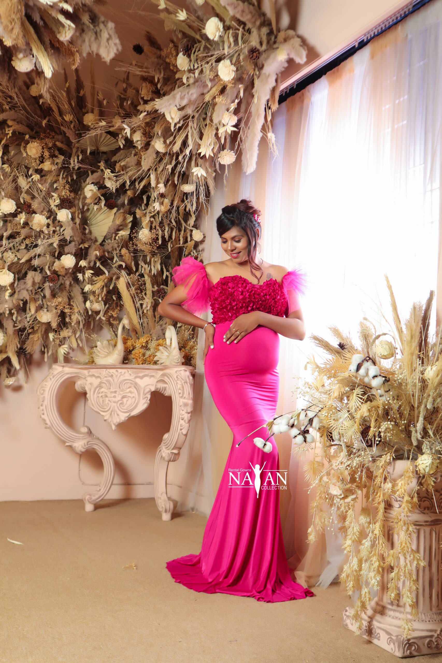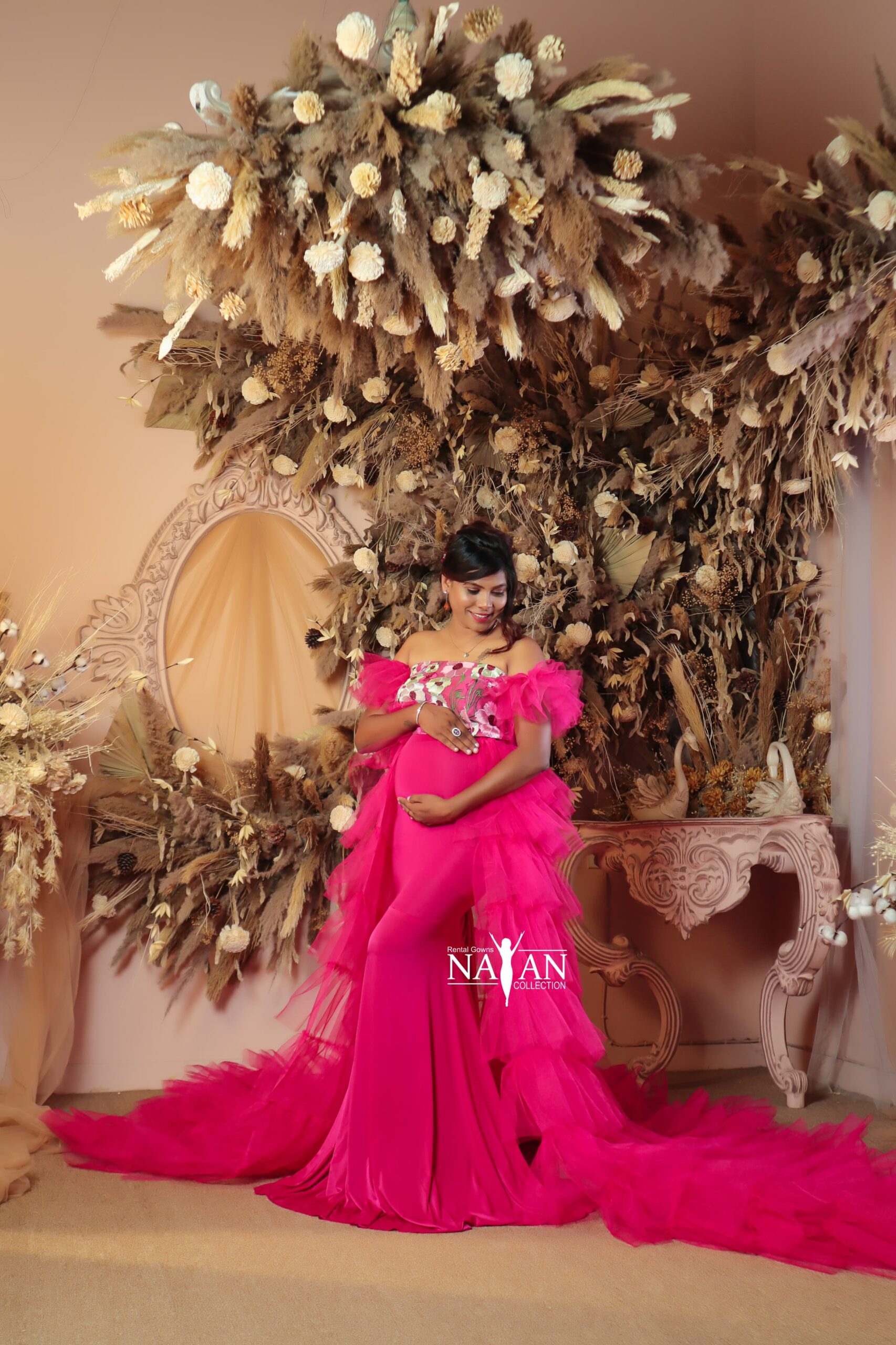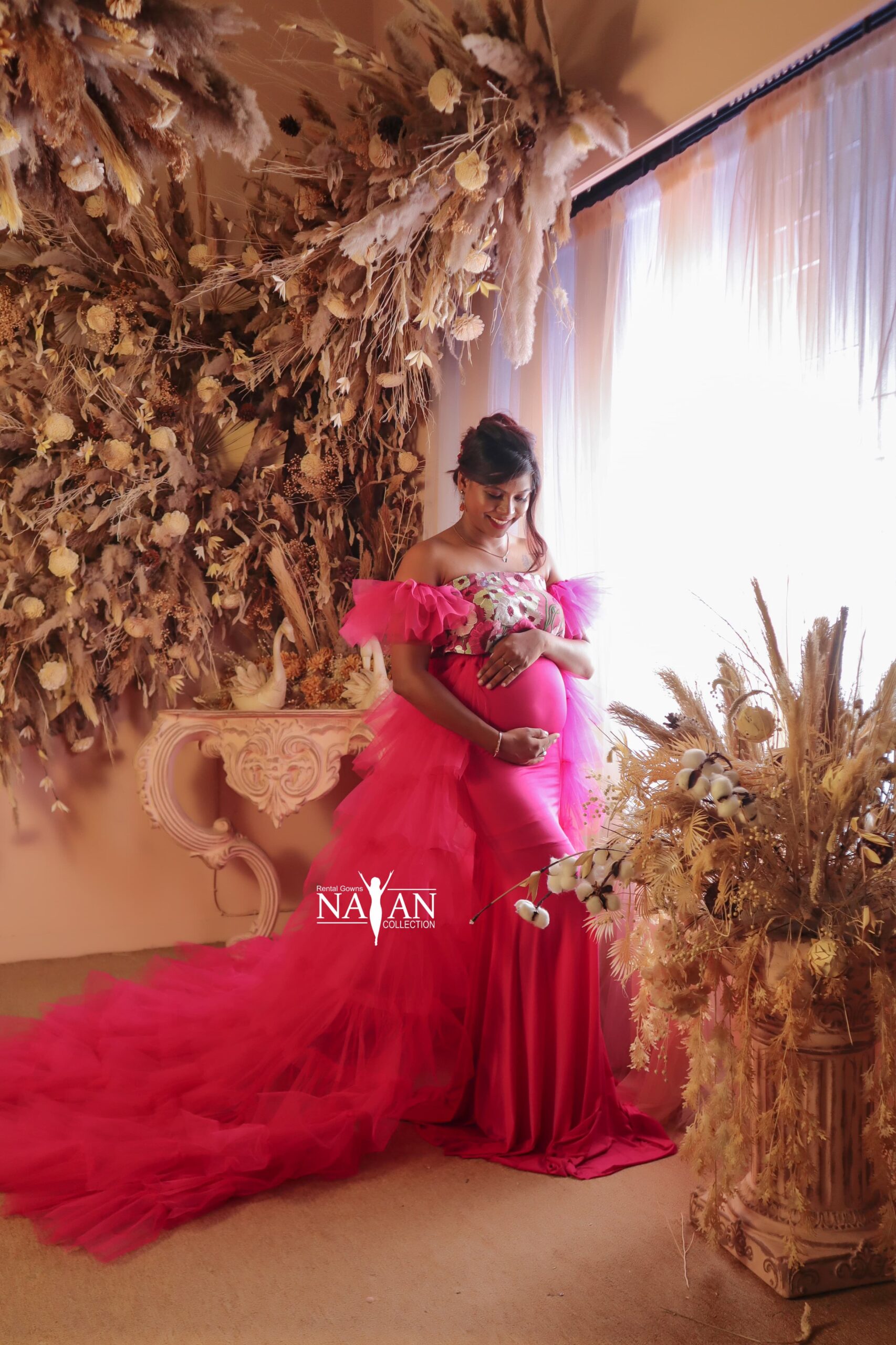 A pink Phoenix ruffle maternity gown is a stunning and elegant dress designed for expectant mothers, combining a bold color with delicate, romantic details.