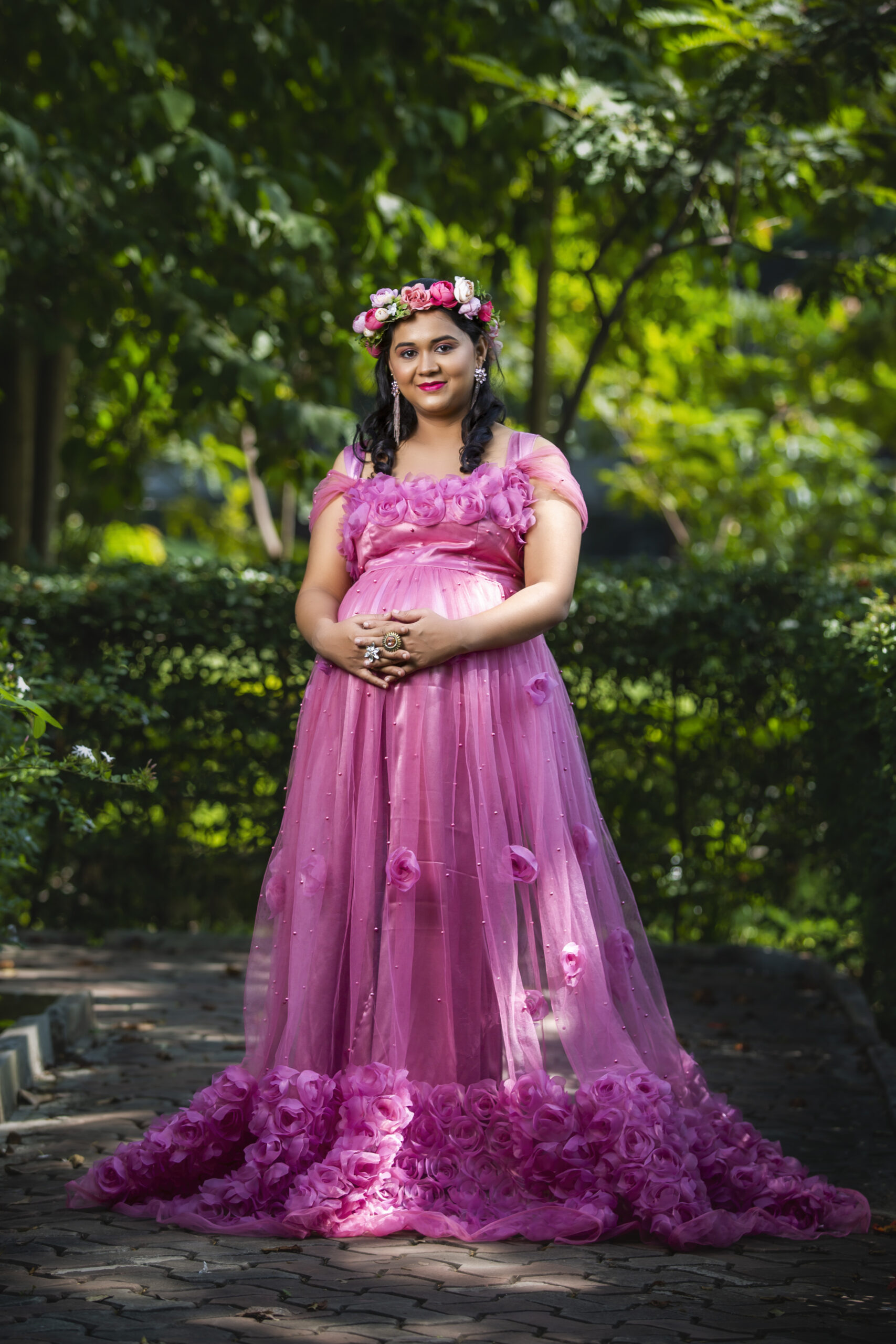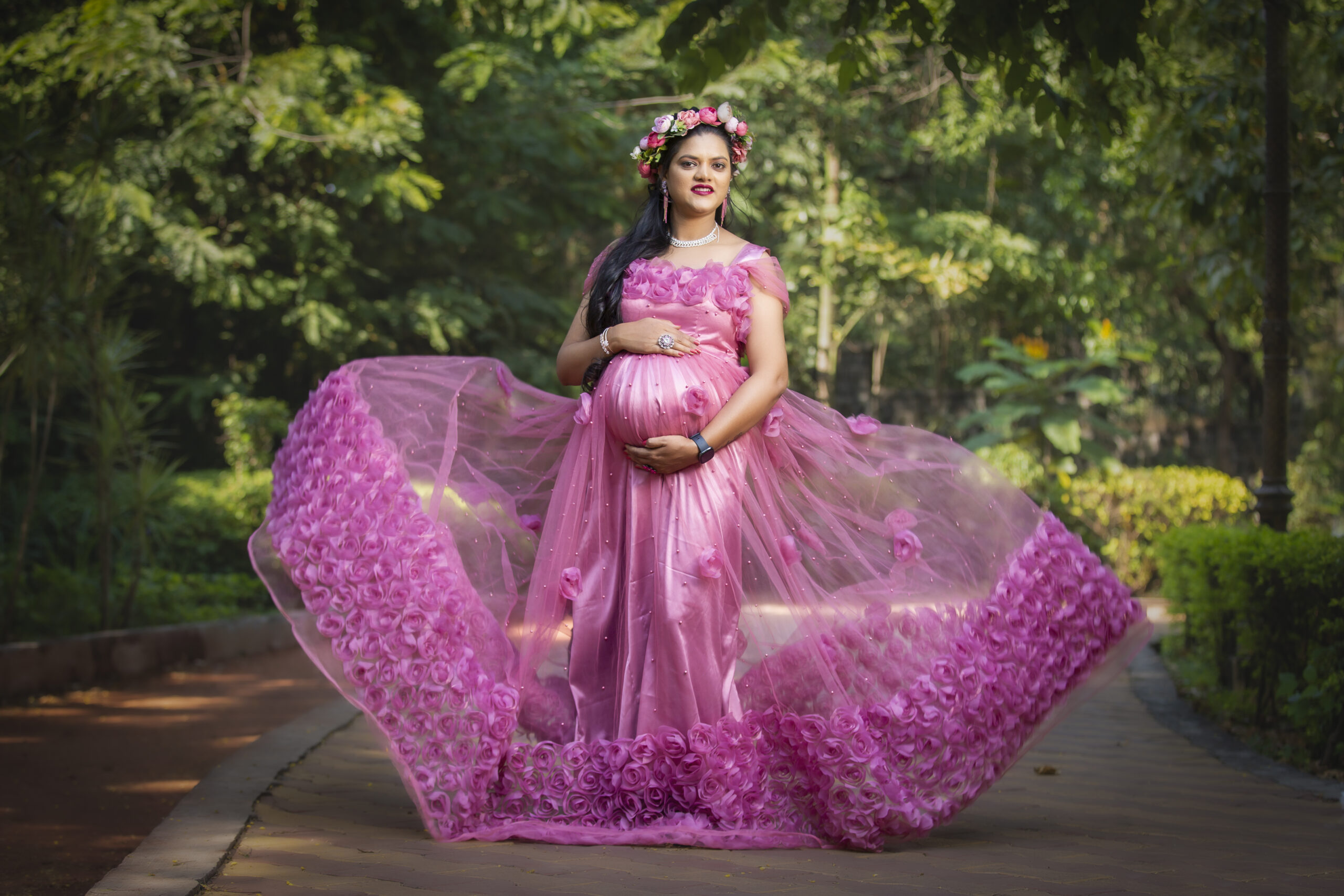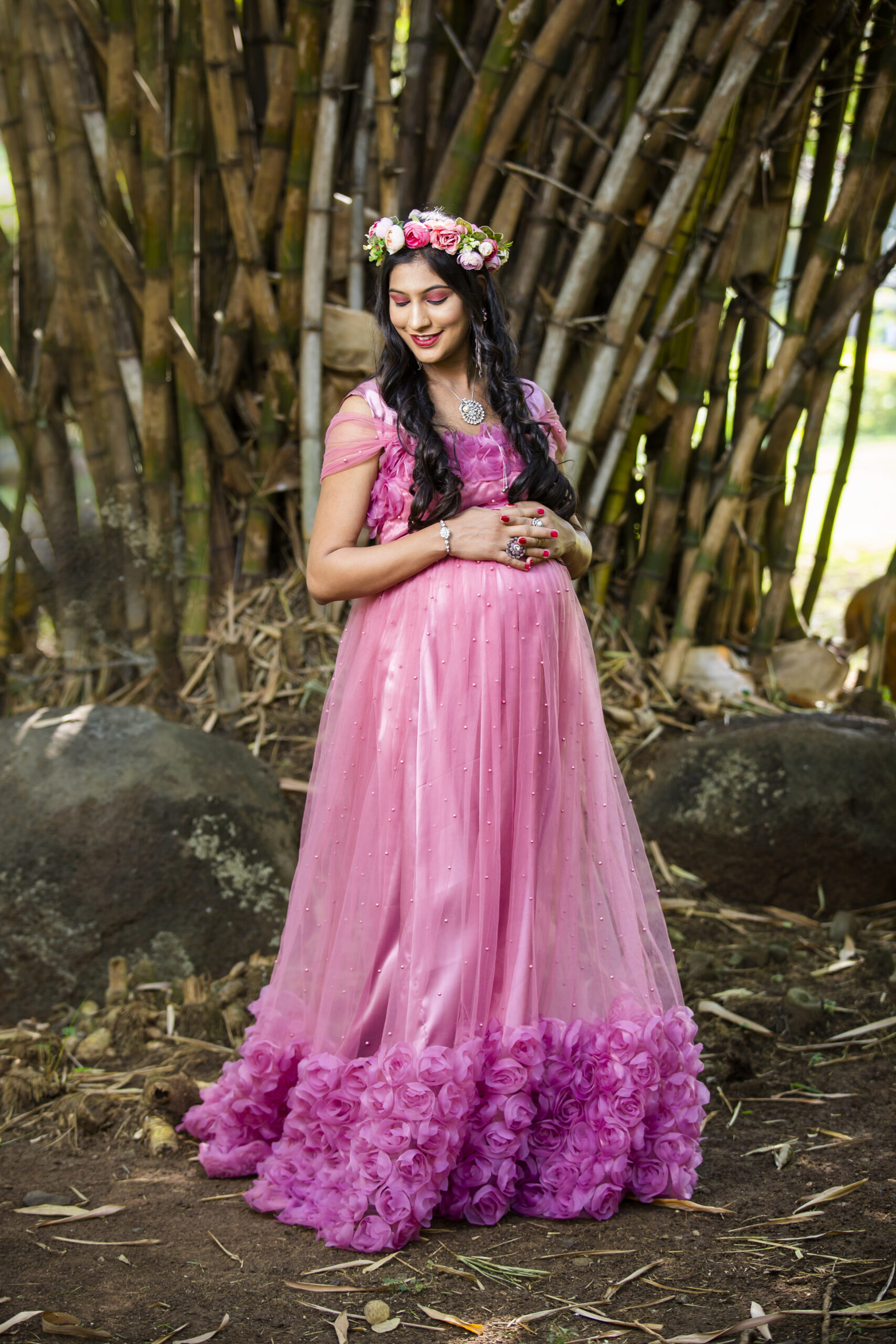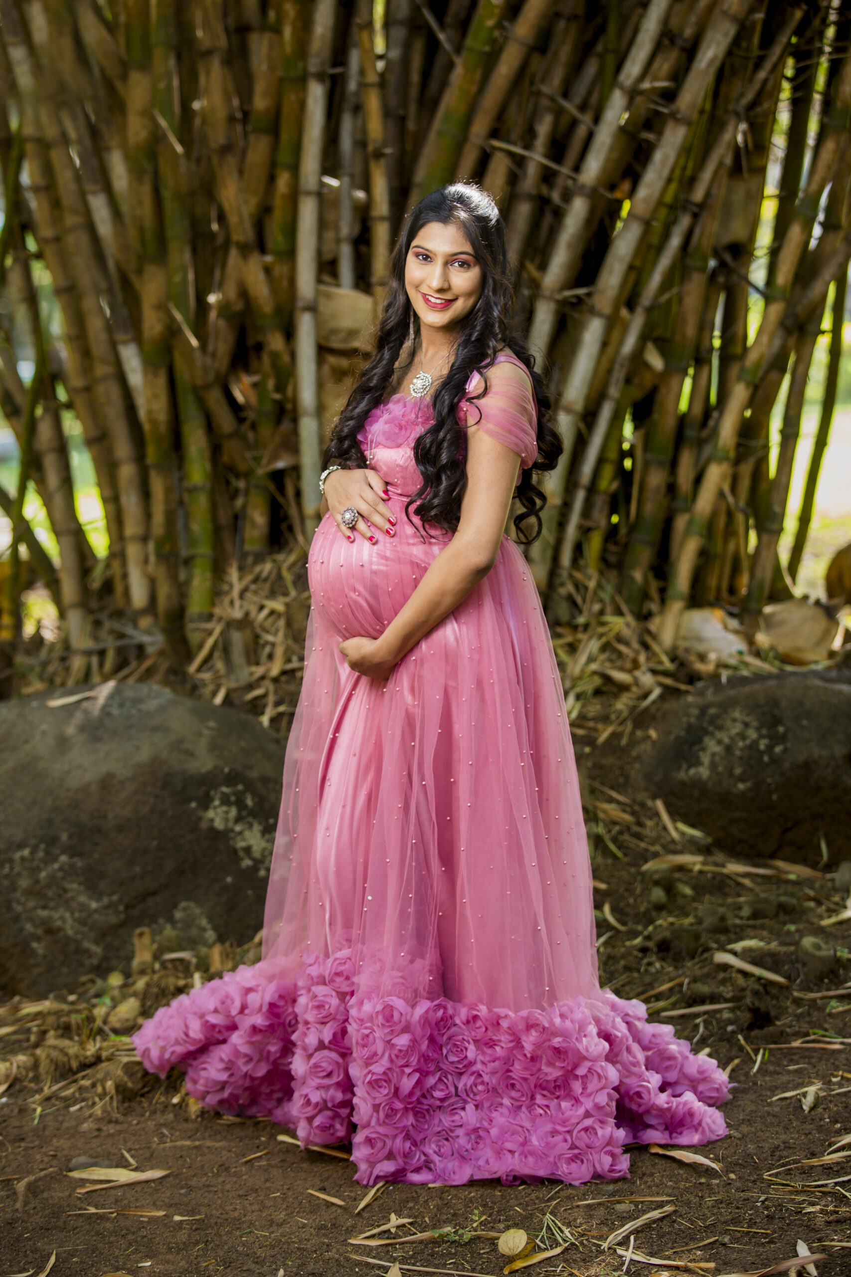 A pink rose maternity gown combines soft color with an elegant, floral-inspired design, perfect for capturing a romantic, feminine look. Picture a floor-length gown in a delicate pink rose shade, crafted from light, flowy fabrics like roses.