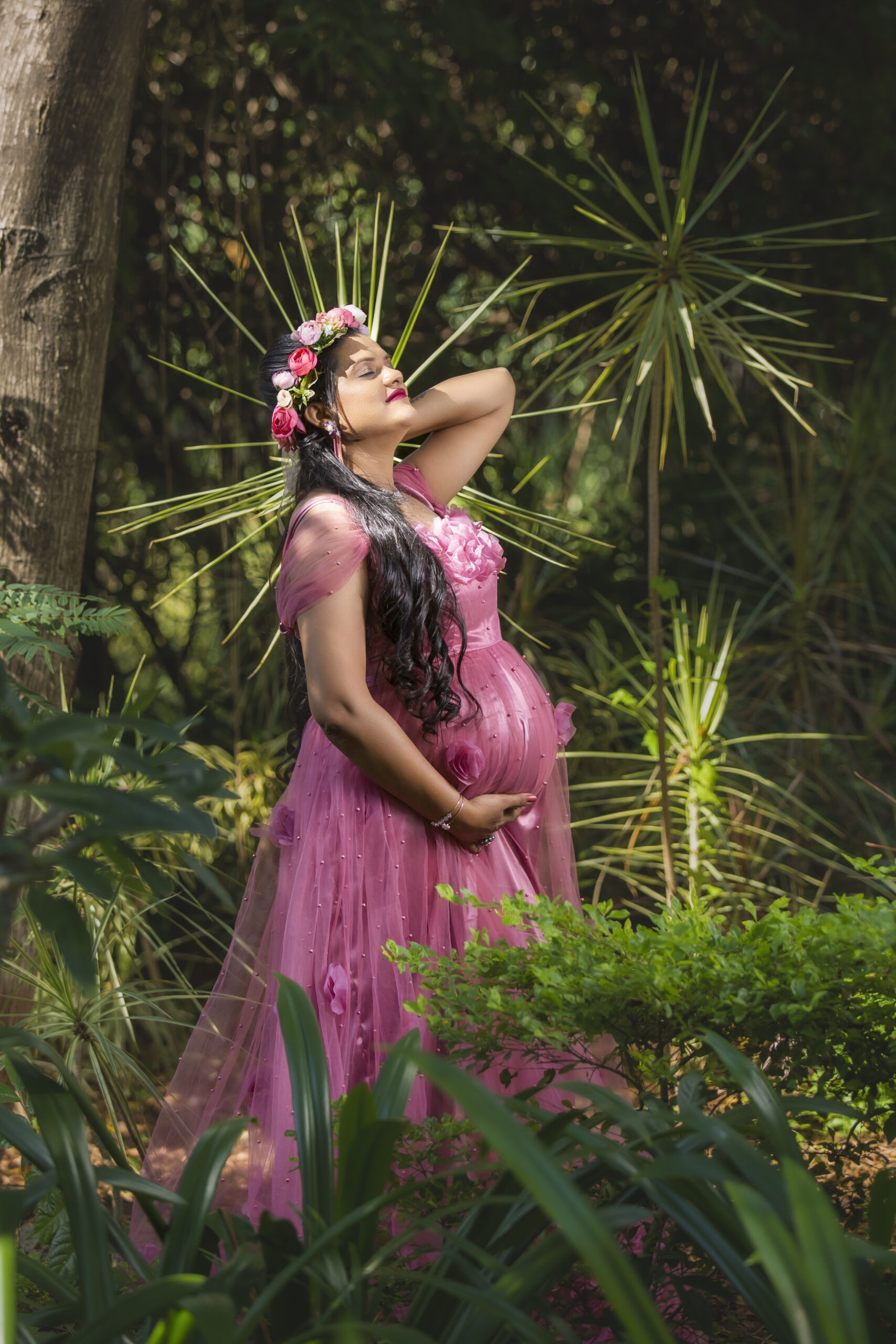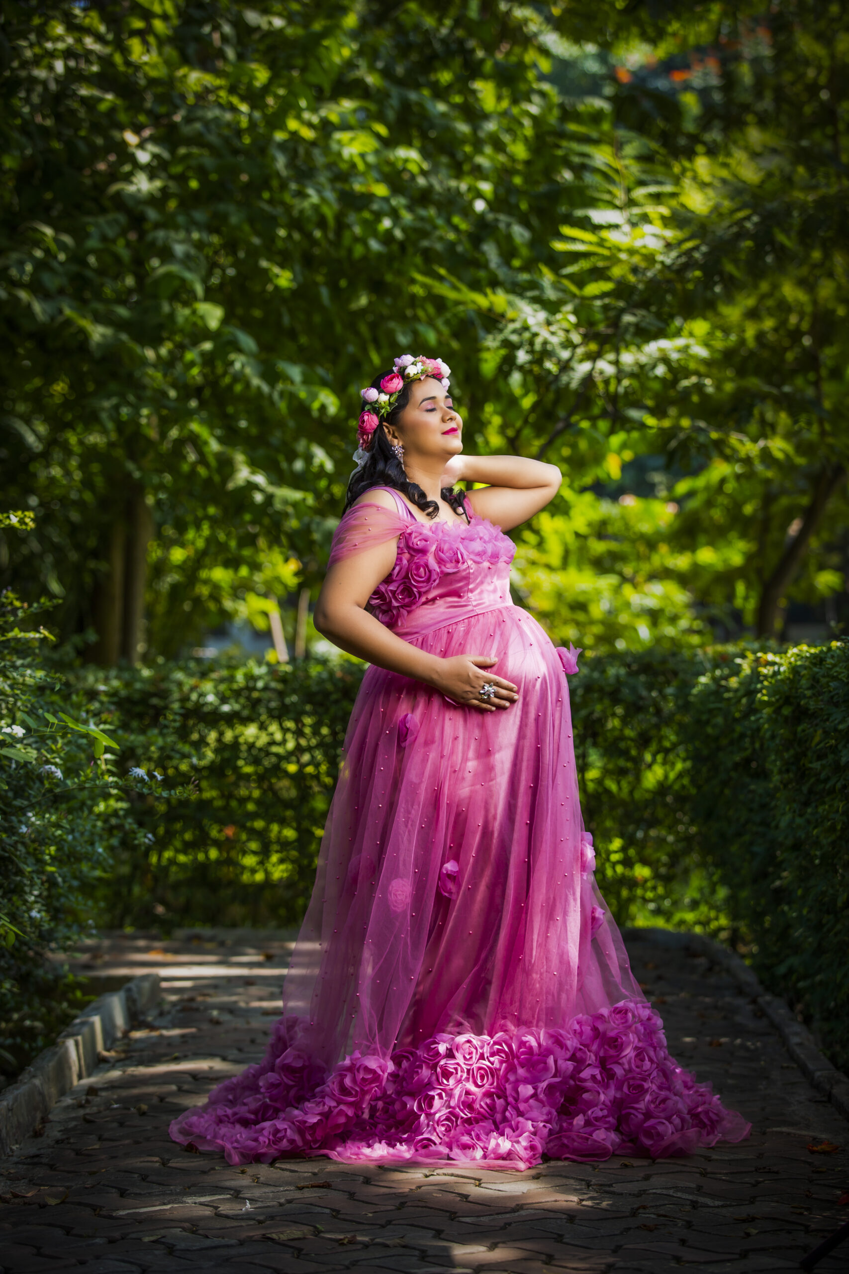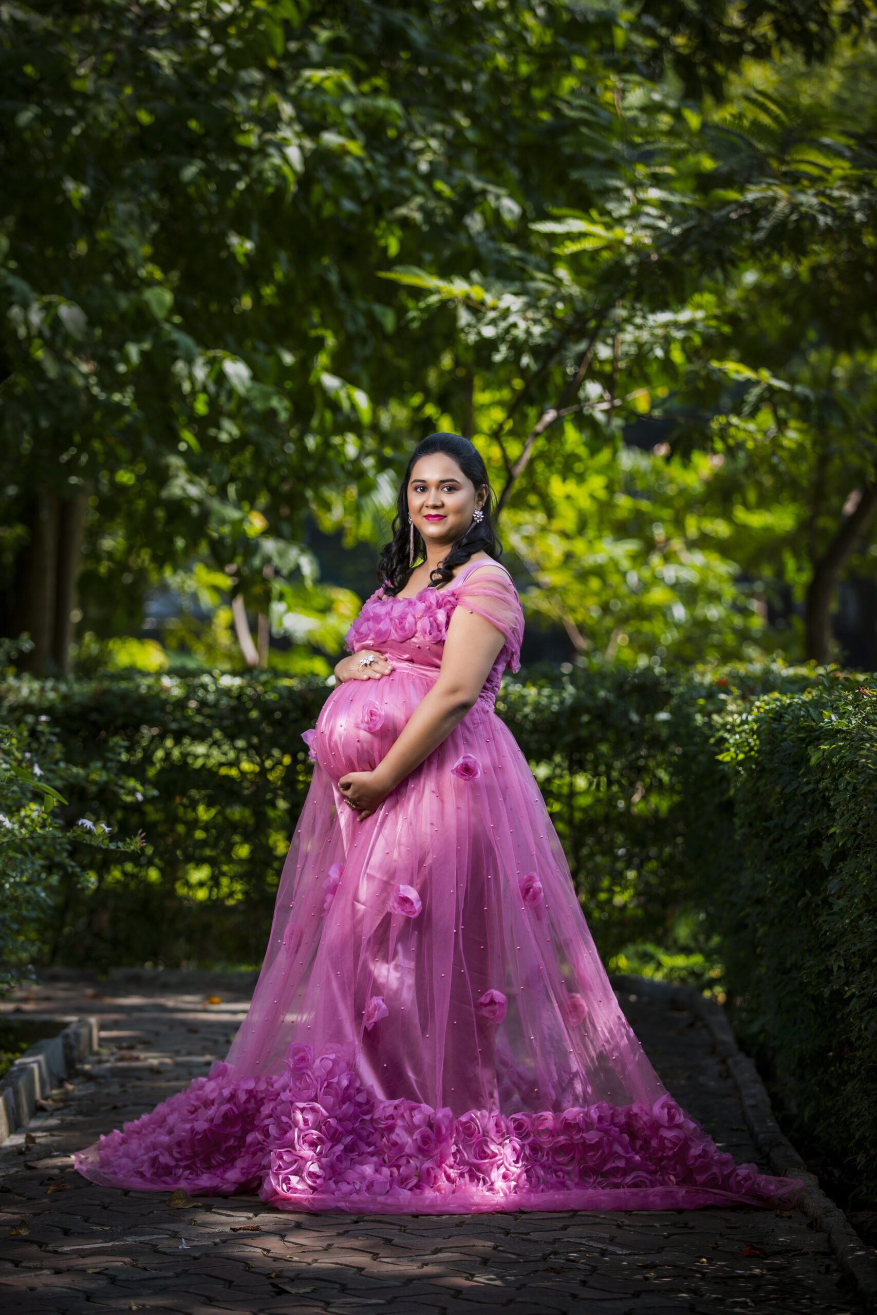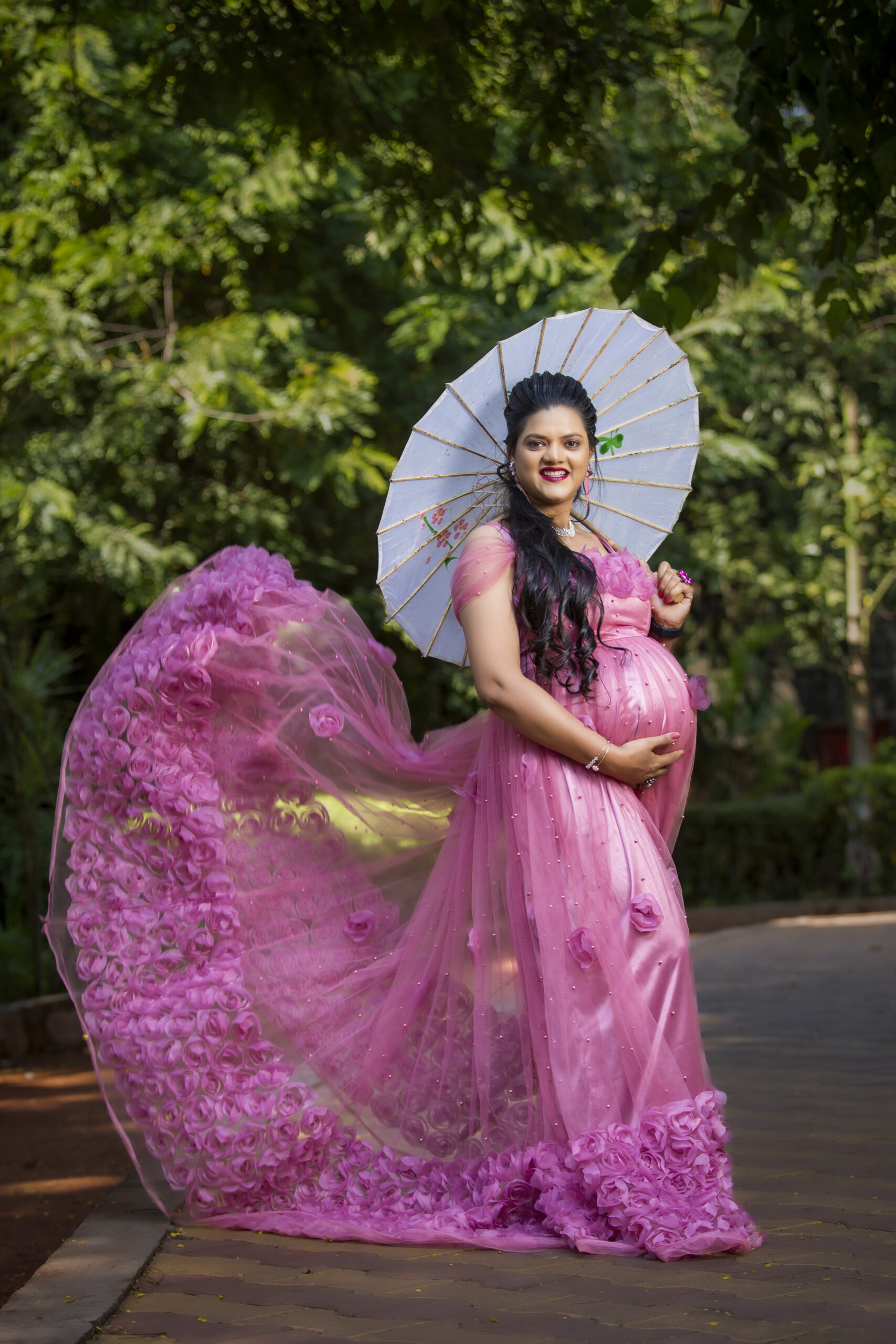 A pink rose maternity gown combines soft color with an elegant, floral-inspired design, perfect for capturing a romantic, feminine look. Picture a floor-length gown in a delicate pink rose shade, crafted from light, flowy fabrics like roses.