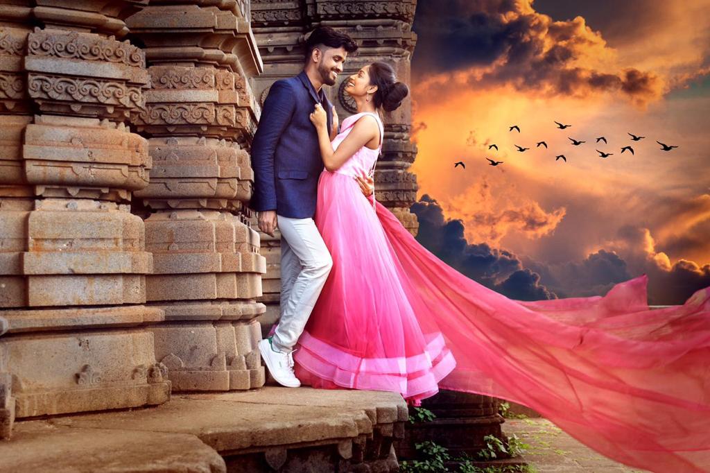 A pink-shaded gown for a prewedding is a beautiful choice that adds a romantic, soft, and dreamy feel to the occasion.
