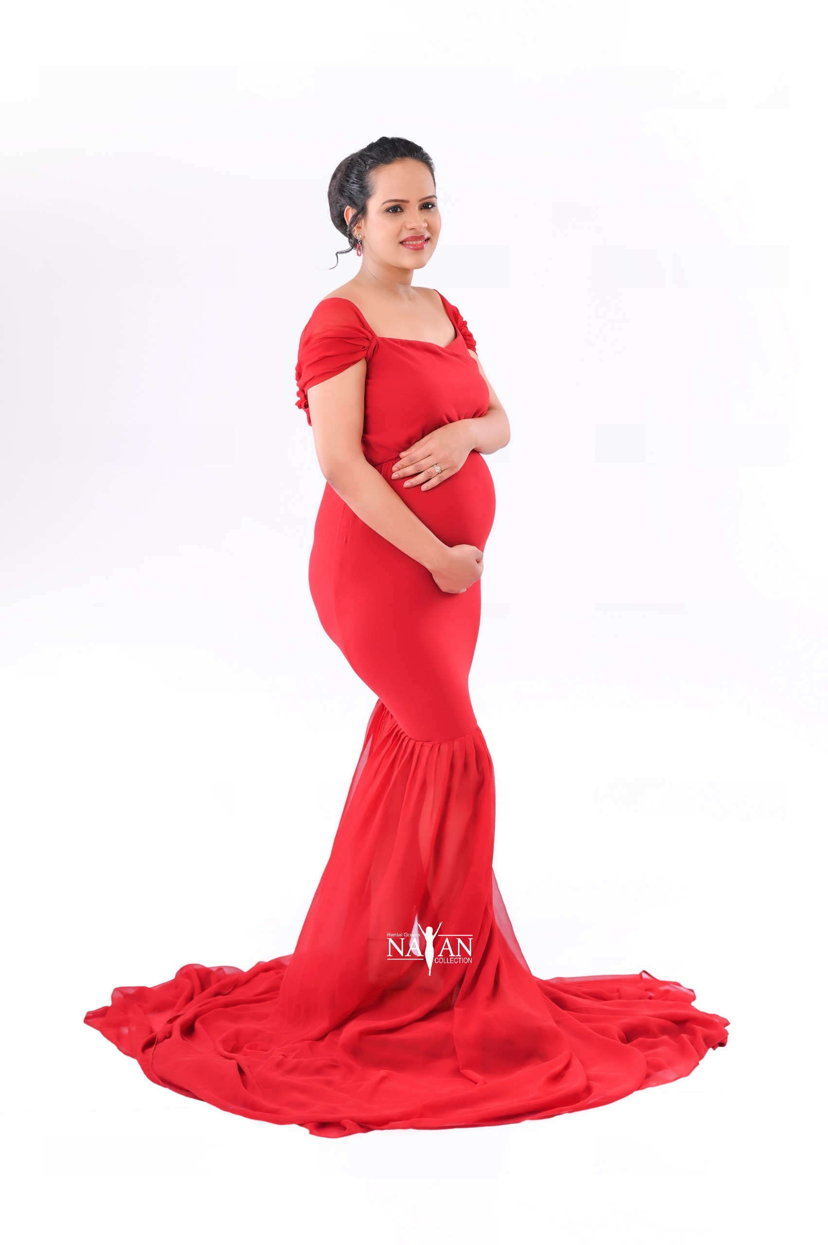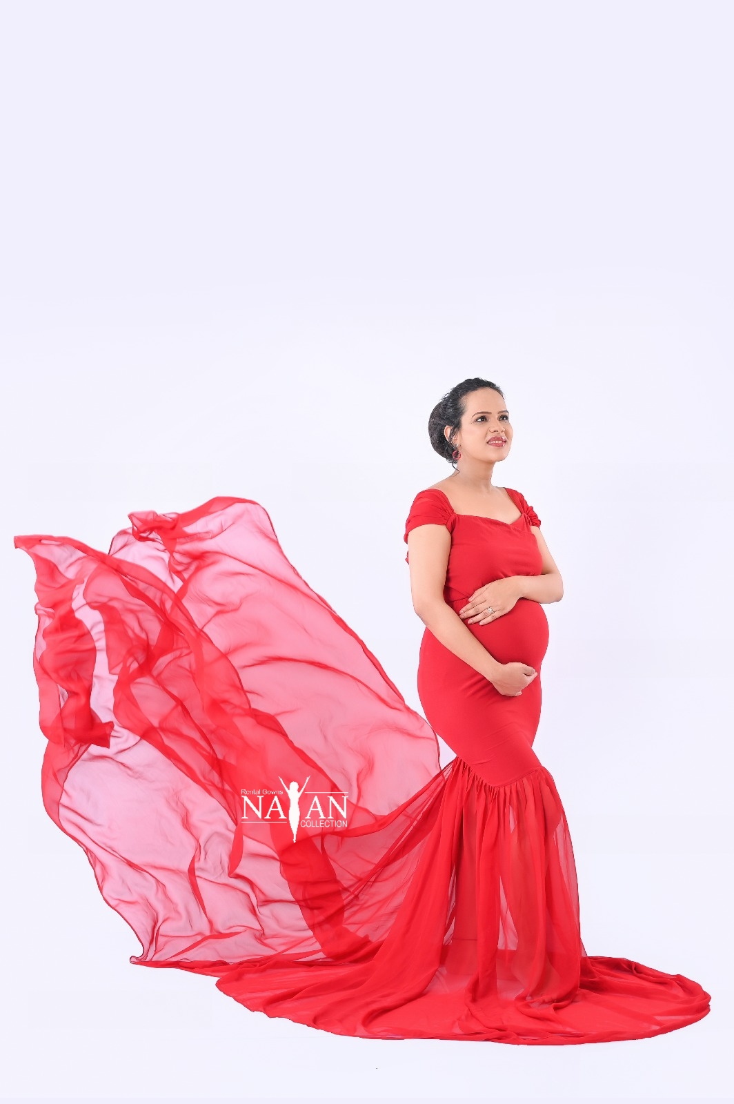The gown is a rich, vibrant red, making a bold statement for special occasions like baby showers, maternity photoshoots.