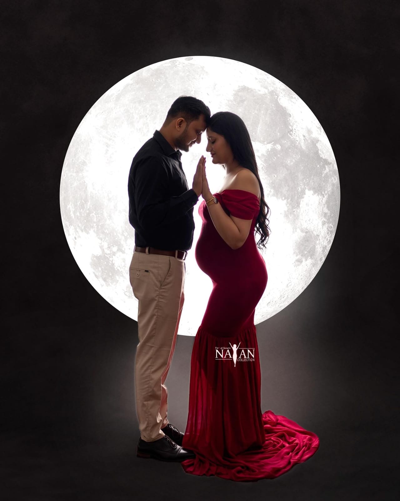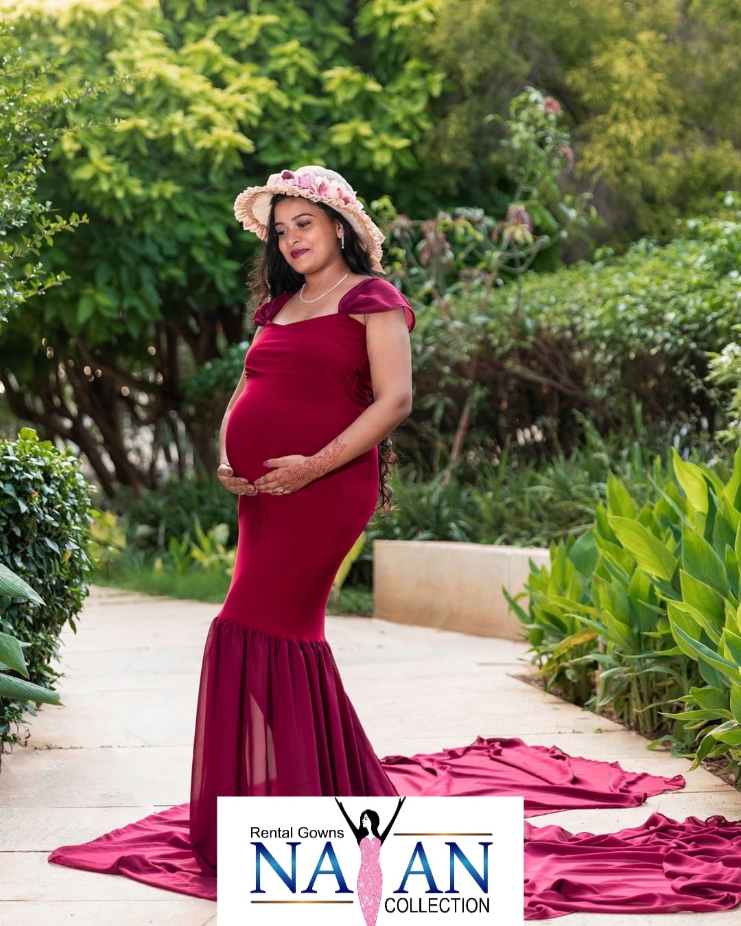 A red long tail maternity gown is a special type of dress designed for pregnant women to wear on formal occasions, such as maternity photo shoots.