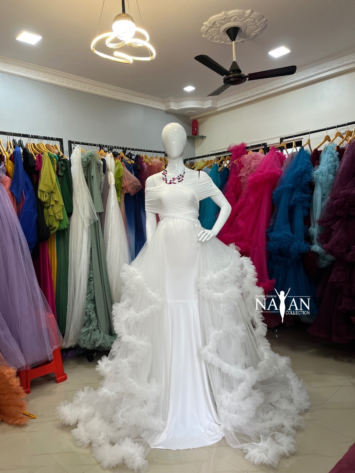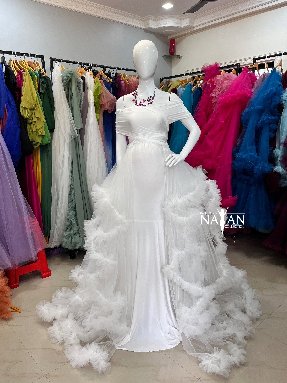 Perfect for special occasions, photoshoots, or any event where you want to showcase your beautiful bump, this gown combines classic white with delicate ruffle accents for a look that’s both enchanting and graceful.