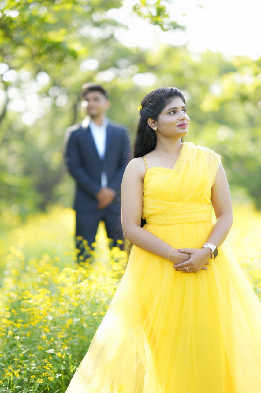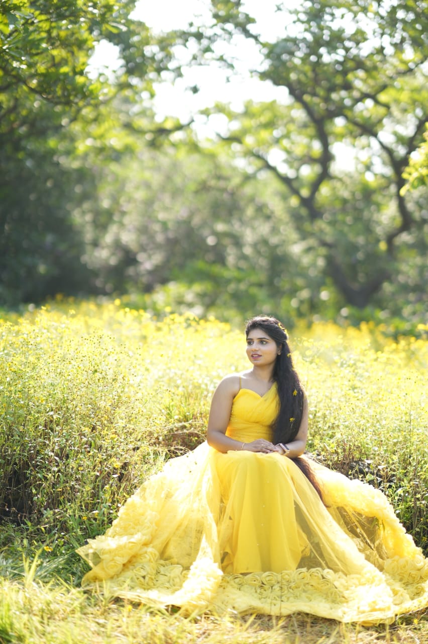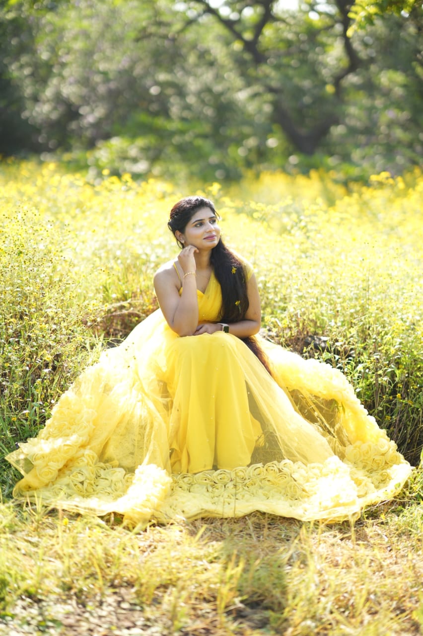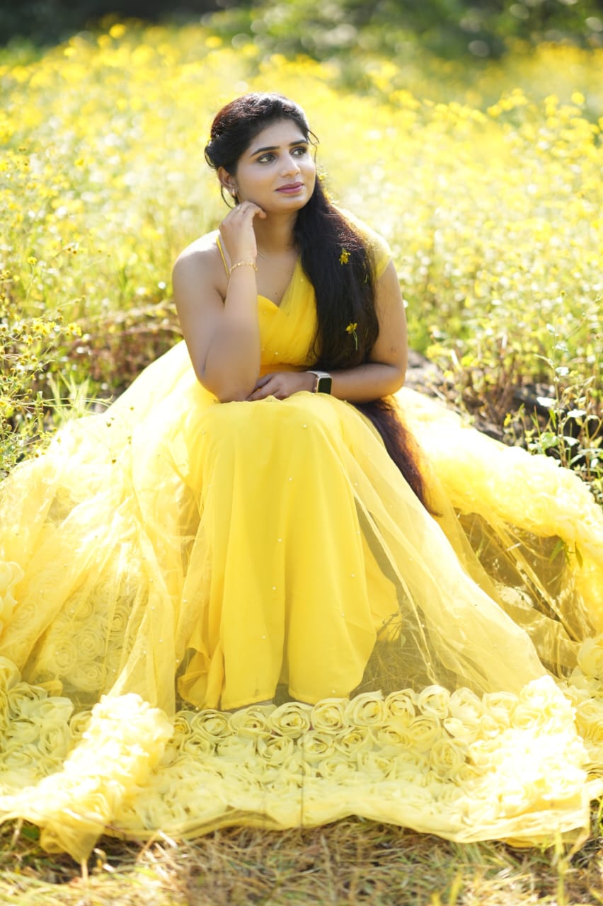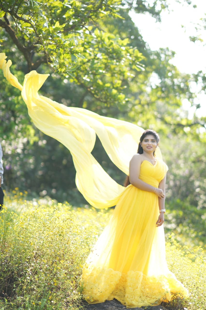 The gown is predominantly in a rich yellow hue, which symbolizes joy, happiness, and positivity.